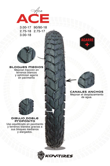 Gracias a sus amplios canales y estructura autolimpiante, la ACE 01 ofrece excelente control en tierra, grava o pavimento húmedo, sin sacrificar suavidad ni confort.