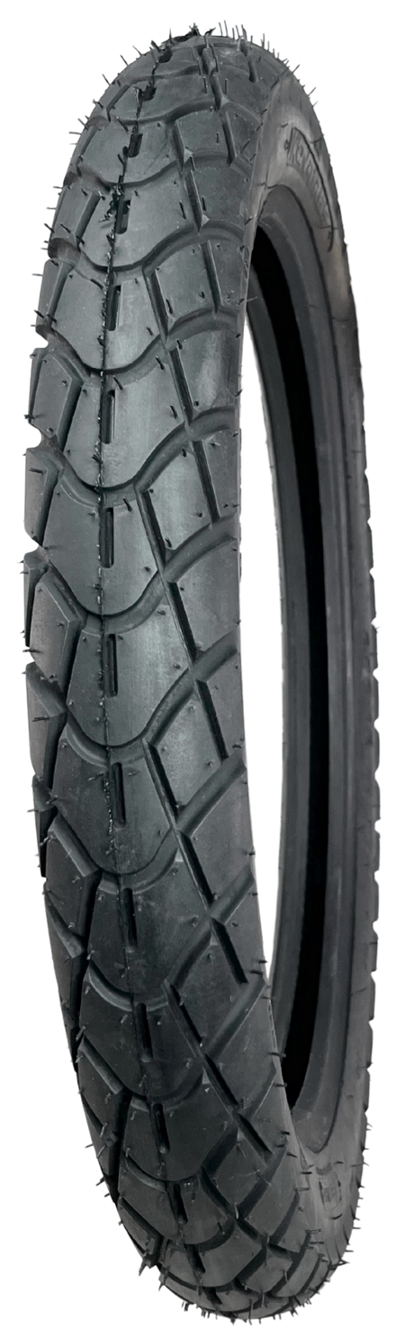 Su diseño en “V” con bloques de caucho y canales amplios garantiza excelente tracción en asfalto y estabilidad superior fuera de camino, mientras sus bloques laterales robustos brindan control total en curvas y superficies sueltas.