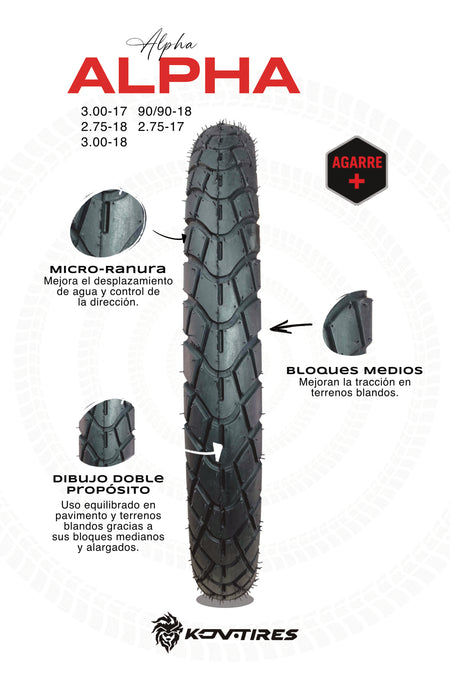 La KOV Alpha (50% asfalto, 50% terracería) ofrece el equilibrio perfecto entre agarre, durabilidad y confort, ideal para motociclistas que enfrentan todo tipo de caminos.