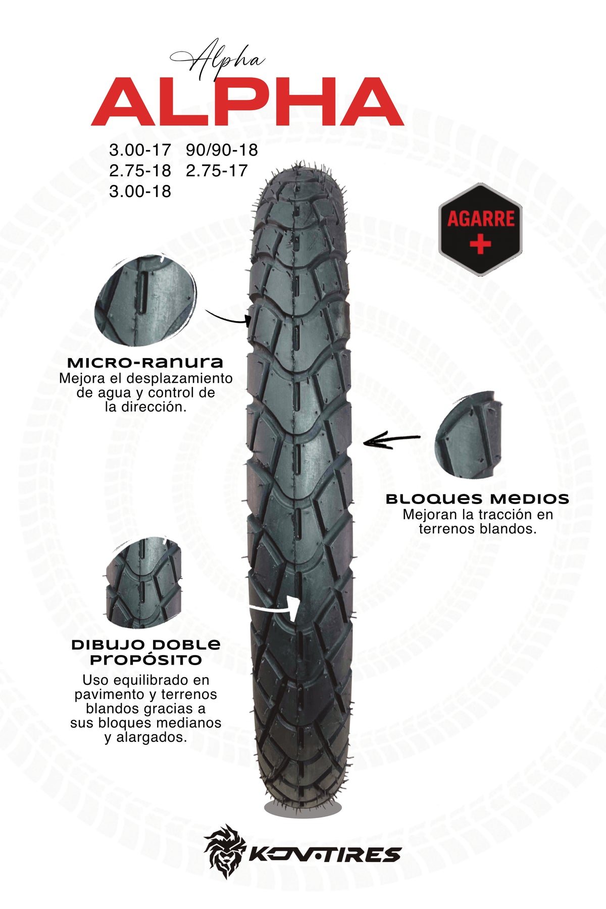 La KOV Alpha (50% asfalto, 50% terracería) ofrece el equilibrio perfecto entre agarre, durabilidad y confort, ideal para motociclistas que enfrentan todo tipo de caminos.
