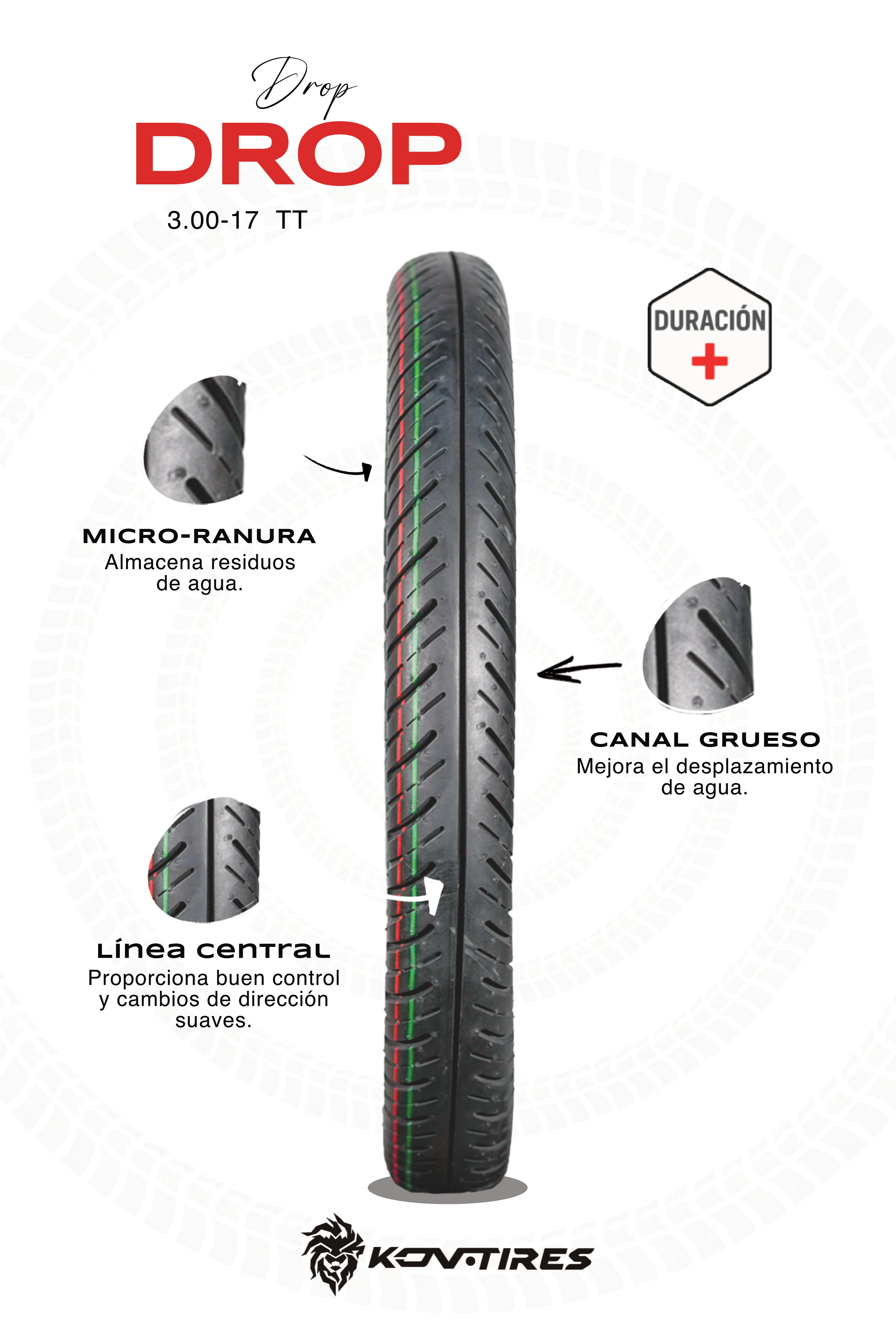 Con un compuesto de caucho optimizado para el agarre en seco, la Drop 01 brinda una experiencia de conducción suave, silenciosa y con gran durabilidad, ideal para el uso diario.