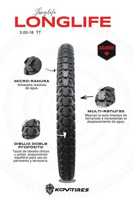 La KOV Longlife Front está pensada para quienes necesitan confianza total en todo tipo de camino. Su diseño direccional de tacos medianos ofrece una tracción firme sobre tierra o grava, mientras que su canal central profundo asegura un desplazamiento eficiente del agua y lodo.