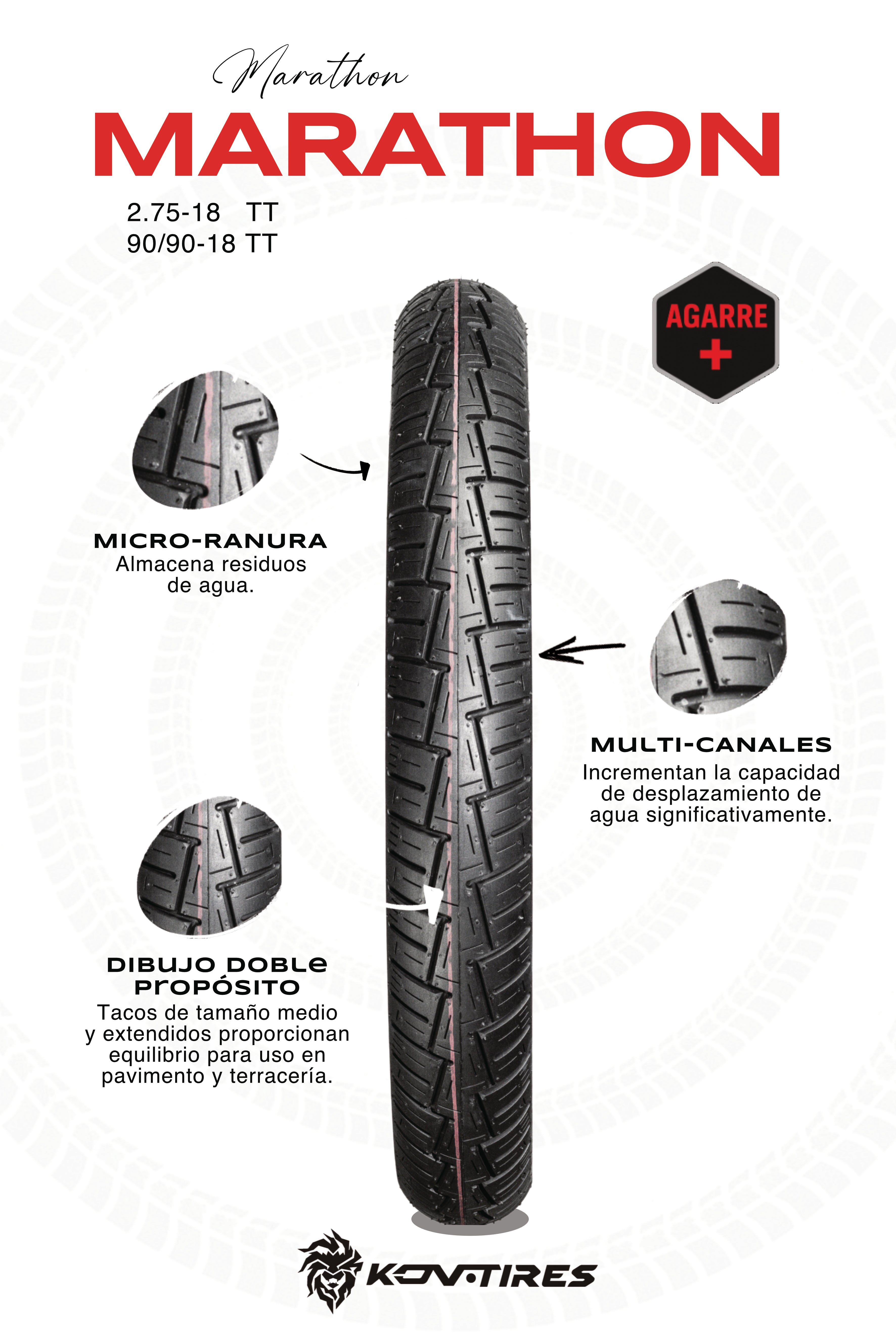 Su carcasa flexible y reforzada absorbe vibraciones, brindando una sensación de manejo ligera y cómoda, incluso en trayectos prolongados. Con la resistencia y durabilidad característica de KOV Tires, la Marathon es sinónimo de rendimiento urbano y touring sin compromisos.