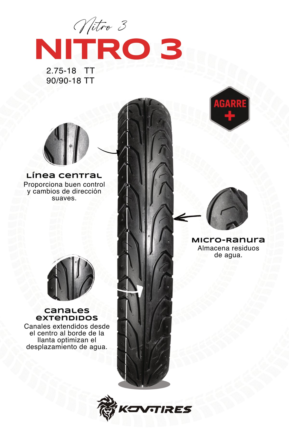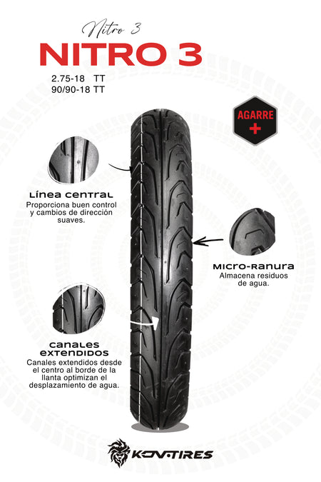 La KOV Nitro 3 combina rendimiento y confort para el motociclista urbano que busca control absoluto. Su dibujo direccional con hombros sólidos brinda curvas estables y precisas, mientras que el canal central profundo permite un desplazamiento eficiente del agua y una conducción fluida.