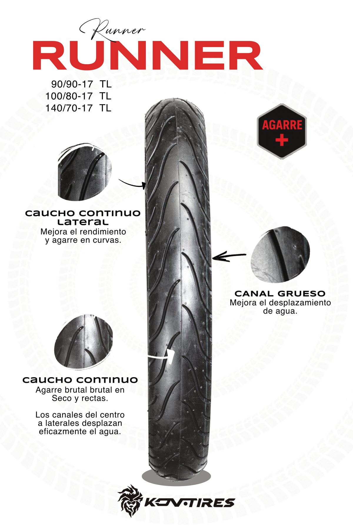 La KOV Runner fue creada para los motociclistas que disfrutan de la precisión, el control y la estabilidad en carretera. Su dibujo de bloques de caucho grandes fluidos con canales ondulados garantiza máximo agarre en seco y un comportamiento estable a altas velocidades.