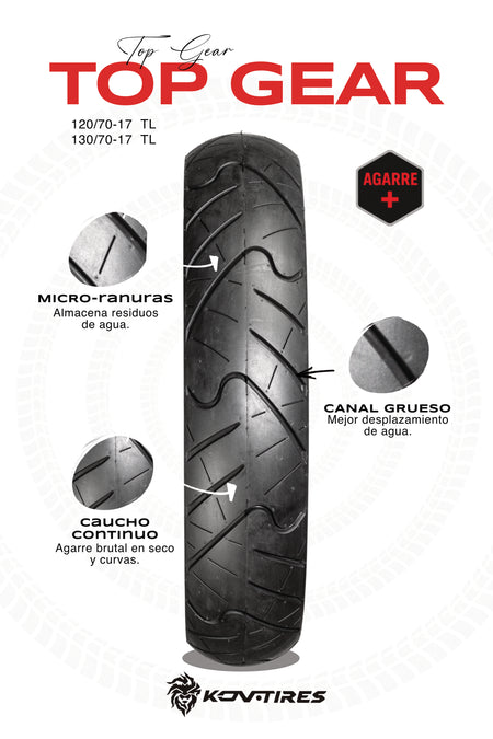 La KOV Top Gear combina fuerza y precisión para ofrecer máximo rendimiento en carretera asfaltada. Sus bloques centrales continuos aseguran un contacto firme con el pavimento, mientras que sus laterales sólidos permiten curvas más estables y controladas, brindando confianza en cada giro.