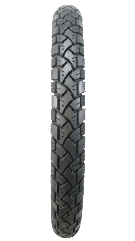 Su diseño en “V” con bloques entrelazados proporciona tracción firme y estable, mientras que sus canales profundos y autolimpiantes garantizan excelente desempeño en tierra, grava o asfalto húmedo.